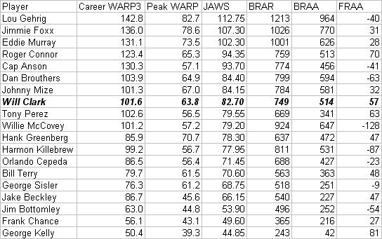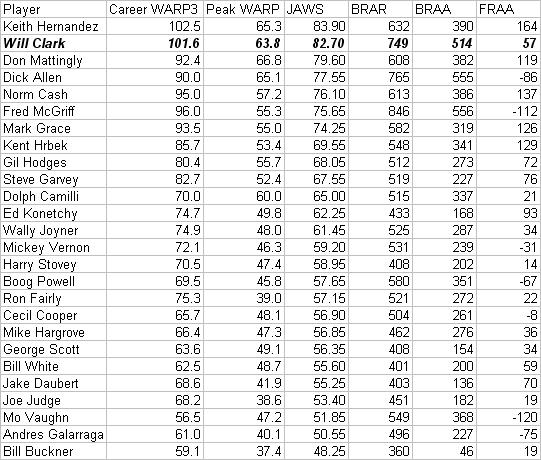 Clark is the second best first basemen not in the Hall of Fame, and if you argue that Hernandez's value is not in the form that the BBWAA would easily recognize, then The Thrill becomes the top first basemen who will not make Cooperstown without some help from the VC. Good luck with that one. Let's see how Clark would stack up against the actual Hall of Fame first basemen: