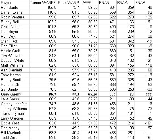 The above table is ranked according to the JAffe WARP Score (or JAWS) system, developing by none other than Jay Jaffe of Futility Infielder and Baseball Prospectus. His new system takes the seven best seasons of a player's career for their peak WARP rather than just the best five seasons in a row. I like it this way better, since it helps cut out on some of the players who fill the requirements. Gaetti is ranked 19th among the 28 third basemen in the RLWHF. He is the third best defensive third basemen on the list for his career after Buddy Bell and Tim Wallach, which helps give him a great deal of value that his bat is missing. Gaetti was a fine player, and a childhood favorite of mine, so I am glad to see he stacks up well enough to be included. On a more hostile note, it is a problem that Ron Santo and Darrell Evans, the top ranked third basemen in the RLWHF, are not enshrined in the real Hall. I think spite is what is making me write this article at 5 in the morning without sleeping.