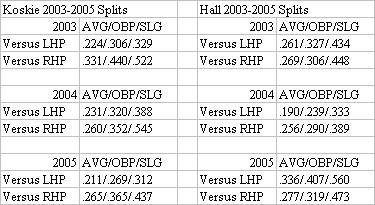 The bane of Koskie has obviously been left-handed pitching, especially in 2005. Hall seems to mash lefties more than righties, although in 2004 those numbers didn't look so good. Then again, his line for the season was .238/.276/.374 at age 24, and he only had 105 at-bats versus lefties, so I'll cut him some sample size slack. If you can combine Koskie and Hall into one player via platoon, you have yourselves quite the offensive force, as well as someone who won't hurt you defensively. Considering the Jays are supposed to pick up a good portion of the tab, this is an excellent move for the Brewers. Of course, they still have Jeff Cirillo and Russ Branyan to play third base as well. I'm sure Doug Melvin has a plan. Can I just say I think he might be one of the top three General Managers in the game?