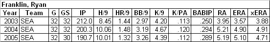 Two pitchers with high walk rates compared to their strikeout rates (or in Padilla's case, high for anyone in the league). They both have trouble with the long ball, and their ERA's are pretty comparable over the past three years. Here is the upside to Franklin: He'll give you 200 innings, whereas Padilla always seemed to be among the missing for a time, whether it be issues with effectiveness or health issues. The downside of course is that Franklin pitched in Safeco, a pitcher's haven, in order to get these numbers. Padilla pitched (suffered) in an offensive paradise. Which means Franklin is most likely going to be an issue in the Philadelphia rotation next year, somewhere along the lines of Eric Milton. Being around for 200 innings isn't a good thing if they are 200 innings of getting beat around by the opposing team. If Philadelphia increases Batting Average on Balls in Play, we can also expect Franklin to suffer some more. I don't have that information on hand, but I am going to make sure that we get it so I can reference it in the future. One thing I noticed looking at Franklin's home/road splits for teh past three seasons: his homerun rate is actually lower on the road than it is at home, 1.36 HR/9 compared to 1.48 HR/9. His walk rate is also lower by one, 2.3 BB/9 in comparison to 3.3 BB/9. Let's look at these year by year to make sure one fluke season isn't throwing off the figures: