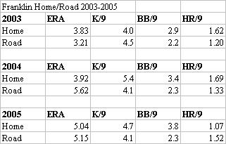 Interesting how his walk rate declines on the road. His homerun rate is all over the place, but it is always too high. Either way, pitching in Philadelphia isn't going to help things at all, so expect continual decline from Franklin. The best to hope for is that he pitches well enough for 3 months but is then kicked out of the rotation because the fifth starter (be it Gavin Floyd, Robinson Tejada or Eude Brito) pitches better than he does. For only $2.6 million the Phillies can afford to do that.