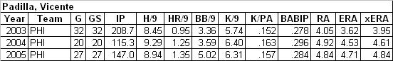 Three signings and a trade to report today. I had to wait until I had more to write about than Shawn Estes becoming the 5th starter in San Diego. After all, I can only ramble on so long about his uses. Let's start with Ryan Franklin heading to Philadelphia to become the fourth starter there. Franklin will be in the rotation until midseason at the earliest, when Randy Wolf comes back from his surgery. Franklin is the fourth starter, but it is possible he can be booted out of the rotation if one of the kids who takes the fifth spot pans out better than Franklin. The former Mariner is essentially replacing the recently traded Vicente Padilla in the rotation. Let's take a look at the stats of the two: