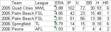 I don't put a lot of weight in his Arizona Fall League performance or his rough stretch in Springfield. The sample sizes are too small. Expect him to start 2007 back where he finished 2006, rural Missouri.