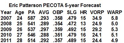 Patterson's 5-year valuation is quite strong and given the fact he hit .297/.359/.457 in his first full season at AAA, he should project as a pretty solid major leaguer in '08. A few questions have been raised about his ability to play second base, but even with below average defense he's quite a commodity: A young second basemen with strong on-base ability and decent pop making the major league minimum is something a number of GM's would kill for.