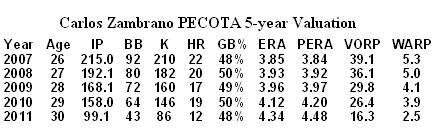 Back in April of 2007, I posted a piece regarding Zambrano's rather pessimistic five-year PECOTA forecast. For those of you who need your memory refreshed, here's a look:
