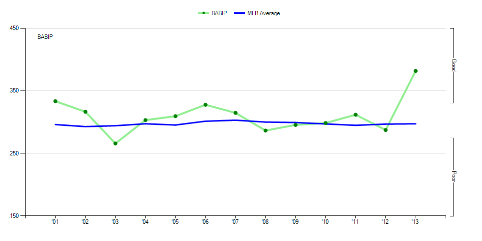 Judging from his batted ball rates, Johnson did see one major jump in a category outside of BABIP, as his 27% line drive rate was significantly higher than his average leading up to 2013. This helps to partially explain the BABIP jump as line drives traditionally have a much higher chance of falling in for hits compared to ground balls or fly balls. In 2013, Johnson hit .820 on line drives, collecting 73 hits in just 89 at-bats. Those 73 hits accounted for 44% of all of Johnson’s hits in 2013. So, yeah, he probably won’t be challenging for the batting title again in 2014.