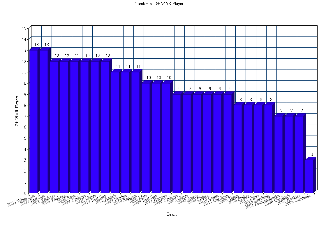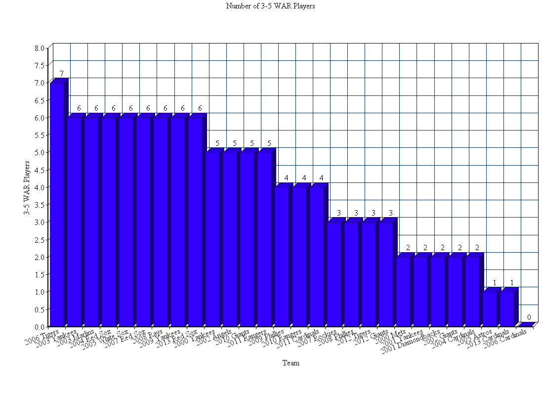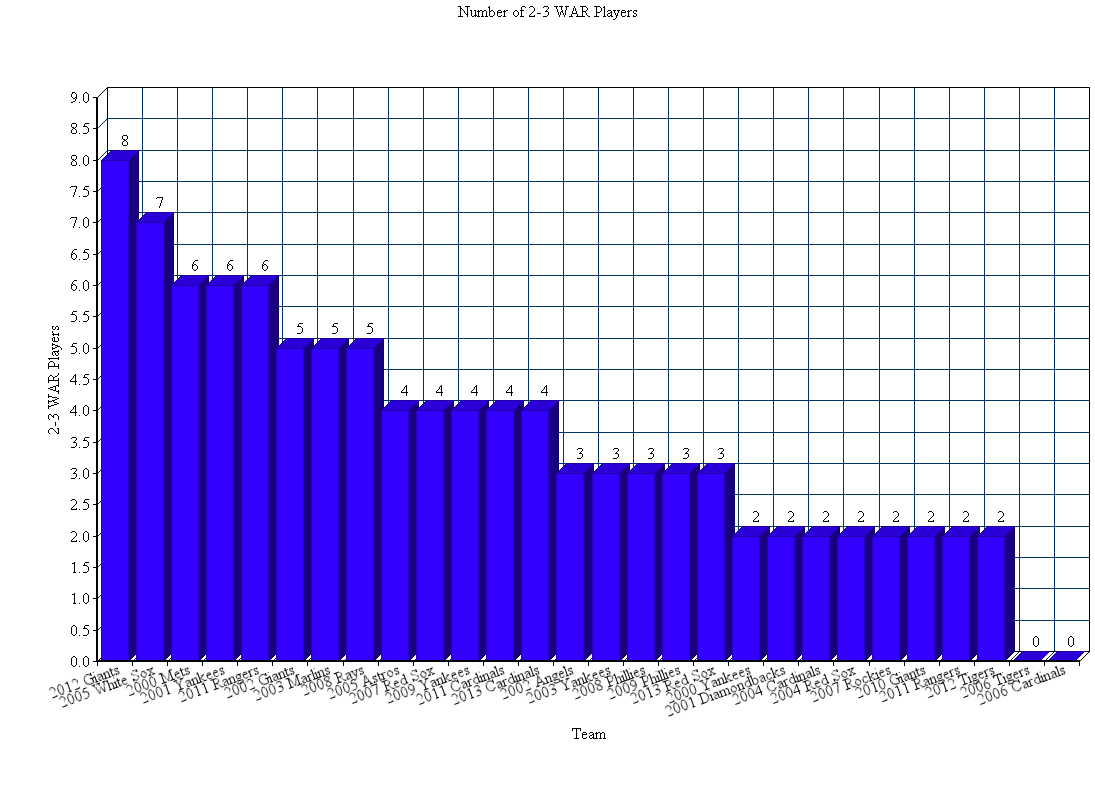 The average club had 3.5 players fall in the 2-3 WAR range, with the median being at 3. Again, there are some big outliers, most notably the 2012 Giants (8), 2005 White Sox (7), 2006 Tigers (0), and 2006 Cardinals (0). The ’12 Giants and ’05 White Sox are particularly interesting cases, as both teams had minimal 3+ WAR players. Based on the data, they seem to be true depth-based teams.