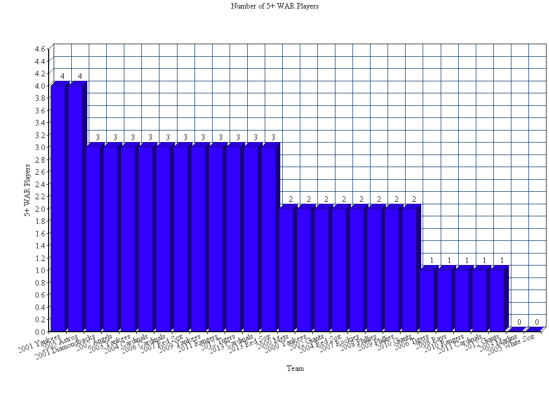 Going further, it appears that most World Series squads have somewhere in the range of 3-6 players with WARs in the 3.0-5.0 range. The average club had 4 players fall in that range, and the median had 4 as well. Noting the outliers in the prior graph, it’s interesting to note that the 2003 Marlins and 2005 White Sox, who each had no 5+ WAR players whatsoever, both had 6 players fall in the 3-5 range. On the other end, the 2005 Astros and 2001 Yankees, who each had four 5+ WAR players, had either one or two 3-5 WAR players. On this graph, the big anomalies are the 2006 Tigers (7 players) and 2006 Cardinals (0). The 2006 Cardinals are of course known for winning the World Series despite winning just 83 games in the regular season (as mentioned above). They had just 3 players in total top 2.0 WAR, so considering their regular season performance, they may not be a great example for this exercise.