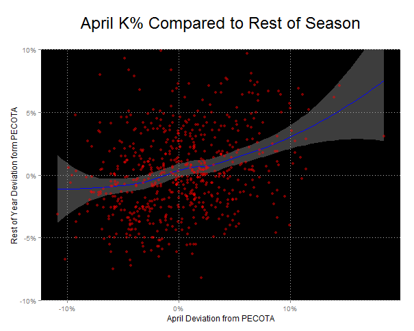 So on average, a hitter can be expected to retain about 24% of the deviation from his projected strikeout rate. So if a hitter is projected to strike out 10% of the time, but strikes out 20% of the time in April, he can be expected to whiff around 12.4% of the time going forward. Here's what the data looks like with a smoothed loess trendline.