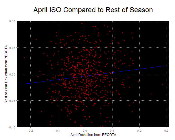 A player's power output is even less predictive. On average, hitters only retain 7% of their April deviation from their projected isolated power. When a player hits for an uncharacteristic amount of power in April, it likely has more to do with random variation than a change in talent.