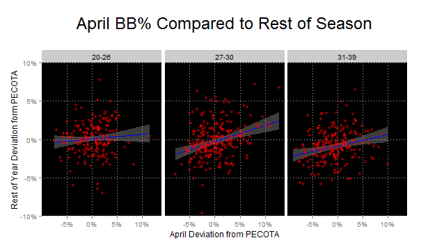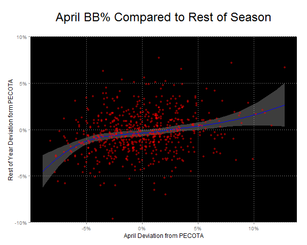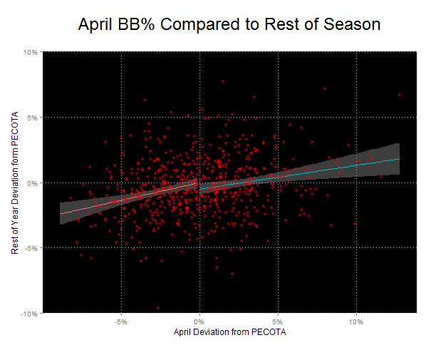 For walk rates, hitters who hit for more power than expected in April are more likely to out-walk their pre-season projection.