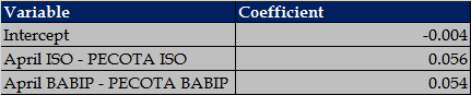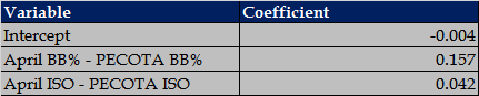 Of course, some un-predicted performances are a little more believable than others. For example, you might think players with a lot of power would be more likely to maintain a high walk rate as pitchers learn not to give him anything to hit. I ran some multiple linear regressions to see what characteristics make a player more (or less) likely to carry his performance through the rest of the year. Here are the results along with some notable takeaways: