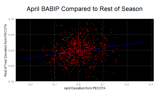 Unsurprisingly, a player's April BABIP isn't very predictive, with just 11% of the residual carrying over through the rest of the season. This data was a little too noisy for a loess curve, so I stuck with a plain old linear trendline: