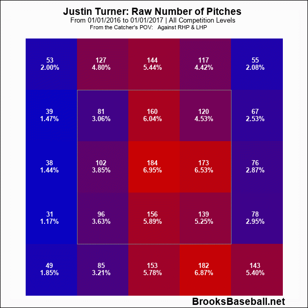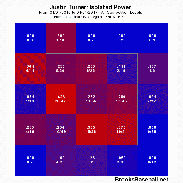 All players have a built-in swing path that demonstrates where they naturally come through the strike zone. For example, D.J. LeMahieu is most comfortable middle-away, while Edwin Encarnacion inherently swings middle-in. For Turner, the path of his bat wants to be anywhere in and down, and yes, that’s where he tends to do the most damage.
