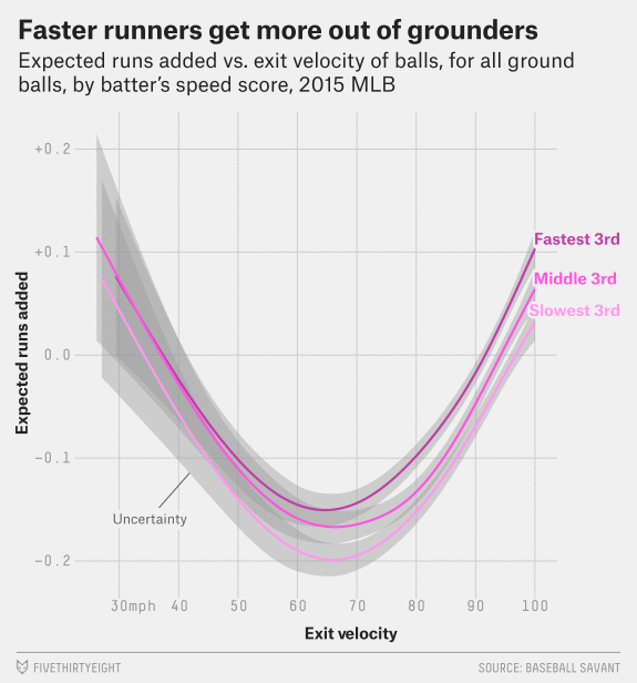For what it’s worth, Bryant’s speed tool was given a current score of 50 by Kiley McDaniel in 2014 with a future grade of 45 (with 50 indicating average). While it’s true that speed correlates better with production on ground balls than exit velocity, Bryant’s speed will be in that below average (45) range before long. When that happens, the authority with which Bryant hits his ground balls will present a problem.