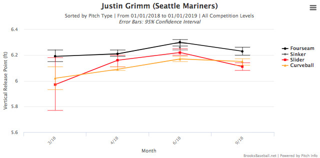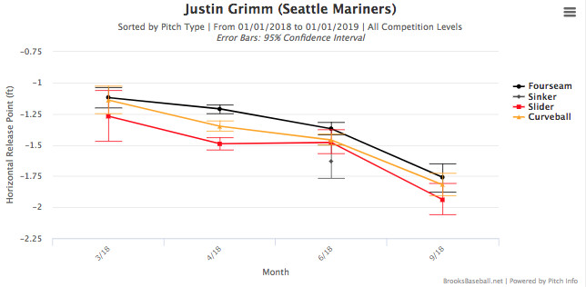 It was in the Mariners organization where Grimm finally got things going again. Over at FanGraphs a couple months ago, Rian Watt astutely pointed out some changes he had made in an interview with him. It took the Mariners a whole two days to sign Grimm after the Royals had released him. They had noticed something that they thought they could possibly fix. After tinkering with his pitch-mix and release points, they had revamped Grimm from his earlier 2018 self.