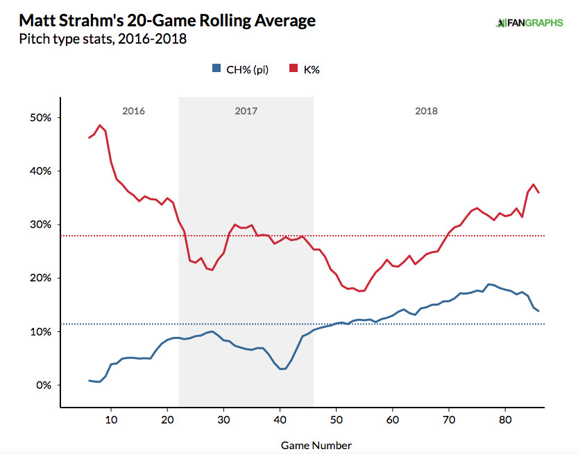 Back in September, I wrote about Padres left-handed reliever Matt Strahm and how his intriguing repertoire out of the bullpen was generating mostly unnoticed performance. I noted his respectable 2.12 ERA and 3.45 FIP in 51 innings, while also pointing out that his numbers were trending upward. In the final month of the season, after that article was posted, Strahm continued to impress, posting a 1.74 ERA and 2.87 over a stretch of 10 1⁄3 innings, striking out 14 and walking four.