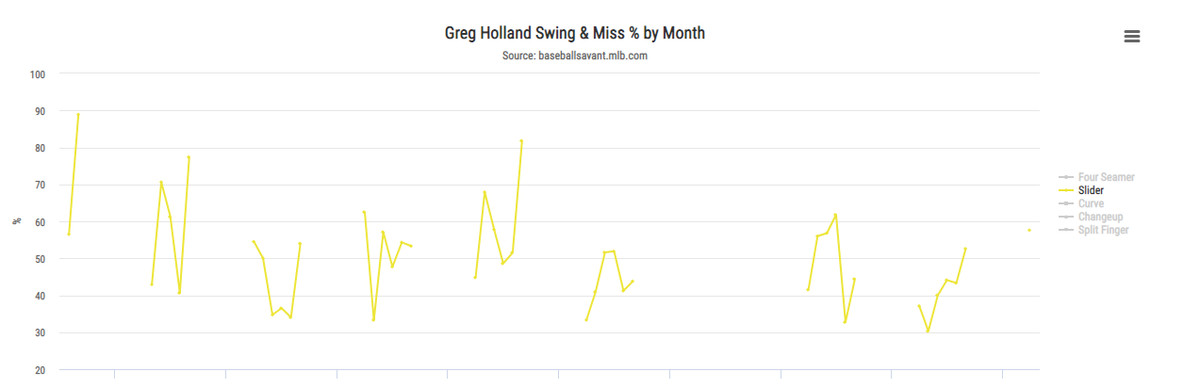 A change in location could be the culprit here. Looking at average vertical locations for sliders in those two time frames that were used above, there has been a clear adjustment for Holland. During his time with the Cardinals, he ranked in the bottom 35 percent of baseball in average horizontal slider location, meaning he was throwing them away from hitters at a higher rate than average.