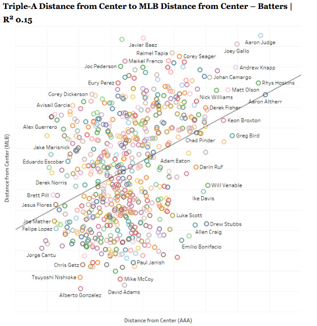 This all mostly follows common baseball thinking that even a casual fan could understand. If we extend our example-making to just rookies and lower the minimum plate appearance threshold to 100 plate appearances, this still holds true. At the bottom of the zone percentage rankings, we can see that big power hitting prospects such as Pete Alonso (lowest among 952 rookies since 2007), Bryce Harper (10th lowest), and Gallo once again (12 lowest) are there.