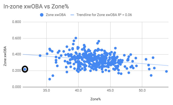 He’s a major outlier when it comes to in-zone xwOBA vs zone percentage, which seems to have a decent correlation (r = .25).