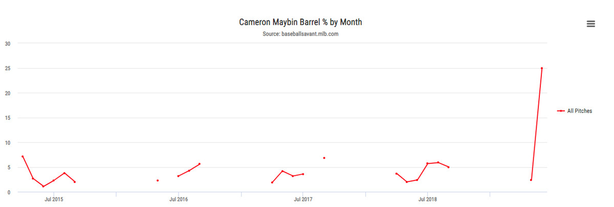 The fourth highest barrel percentage for the month of June is where a surprise emerges. Long-time veteran outfielder Cameron Maybin holds this spot, barreling a fourth of his batted balls (eight out of 32), going against the profile developed on his game through thousands and thousands of plate appearances. Yes, I know he was just put on the injured list with a calf strain, but all of this is still relevant.