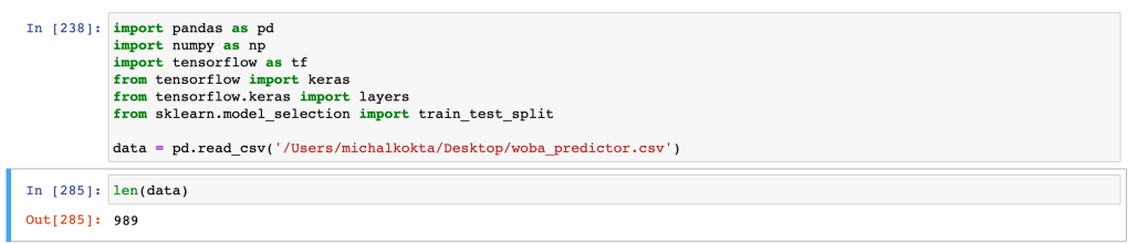Using Statcast data and a bit of machine learning, I have decided to train a shallow neural network to try to do just that. I will post snapshots of the Jupyter Notebook throughout the analysis to make it a little easier to follow.