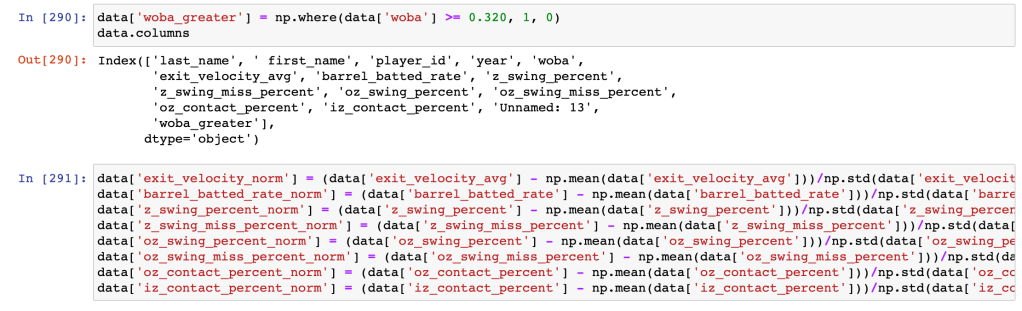 I also created a column that was either "1" if wOBA was >= .320 for that particular player-season, and "0" otherwise. This would be the "true label" the neural network would try to predict. I picked the .320 threshold for wOBA, as that is roughly the league-average. In effect, the network would learn to differentiate between a below-average offensive performer, and an above-average one. Finally, I normalized all the column inputs, as, for example, the exit velocities are on a different scale than the statistics expressed in percentages.