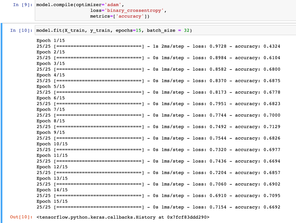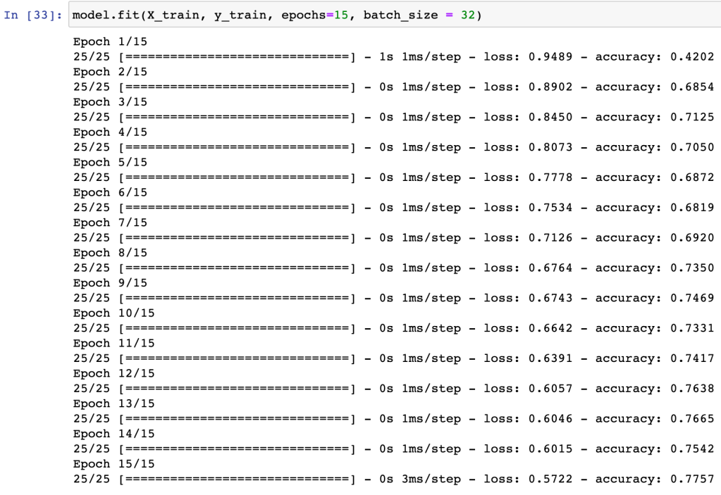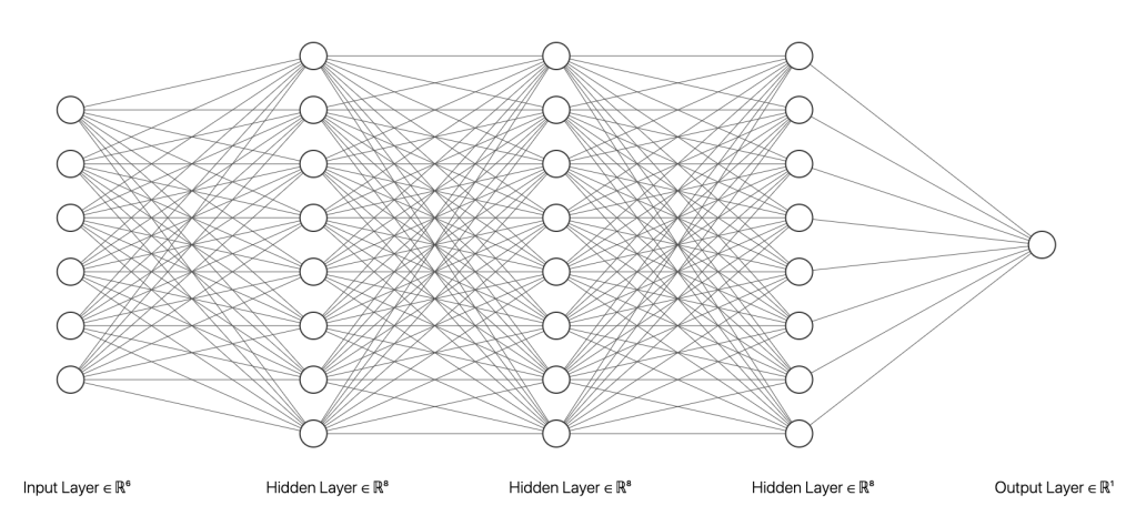 How did I arrive at 8 units in a hidden layer? Since at most I would use 8 input features, I picked that as the number of units in the first hidden layer. I wanted to keep the number of units consistent across layers for simplicity. And how did I decide on three hidden layers? I simply did a run with two hidden layers, and then one with three, and I got better results with three. Going to four started overfitting the training data, and so I settled on three hidden layers.