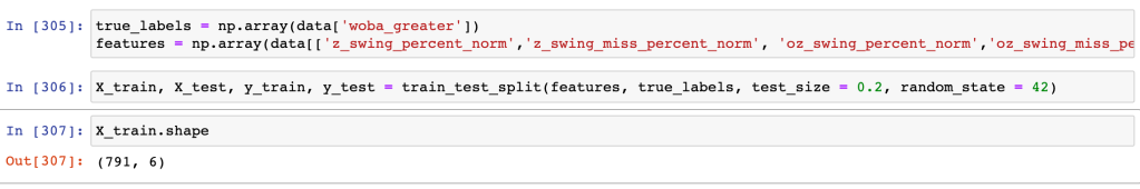 With what probability could we predict whether someone’s wOBA is over .320 using only plate discipline statistics, while knowing nothing at all about what happens when bat meets ball? This was my first scenario. In particular, the input features used in the training set were – all normalized – zone contact rate, zone swing rate, zone swing and miss rate, outside zone contact rate, outside zone swing rate, and outside zone swing and miss rate.