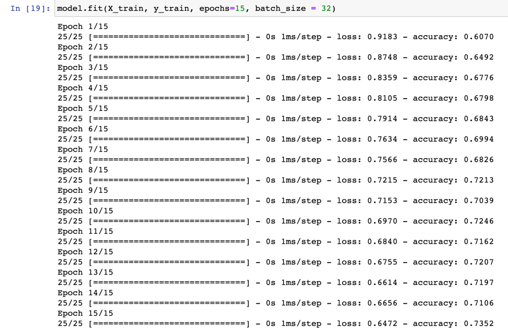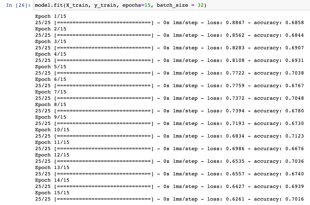 I had 80% of my overall dataset in the training set, and 20% in the test set. The network is trained on the training set, and the test set is used to gauge the accuracy of the network on data it hasn’t seen before. This resulted in 791 items in the training set, and 198 items in the test set. Here are the results after the network has learned its parameters following 15 passes through the training set: